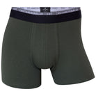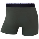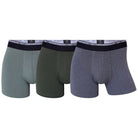 Este pack é constituído por 3 boxers de algodão (1 verde escuro, 1 verde azeitona e 1 cinza médio) com elástico preto e cinza.
