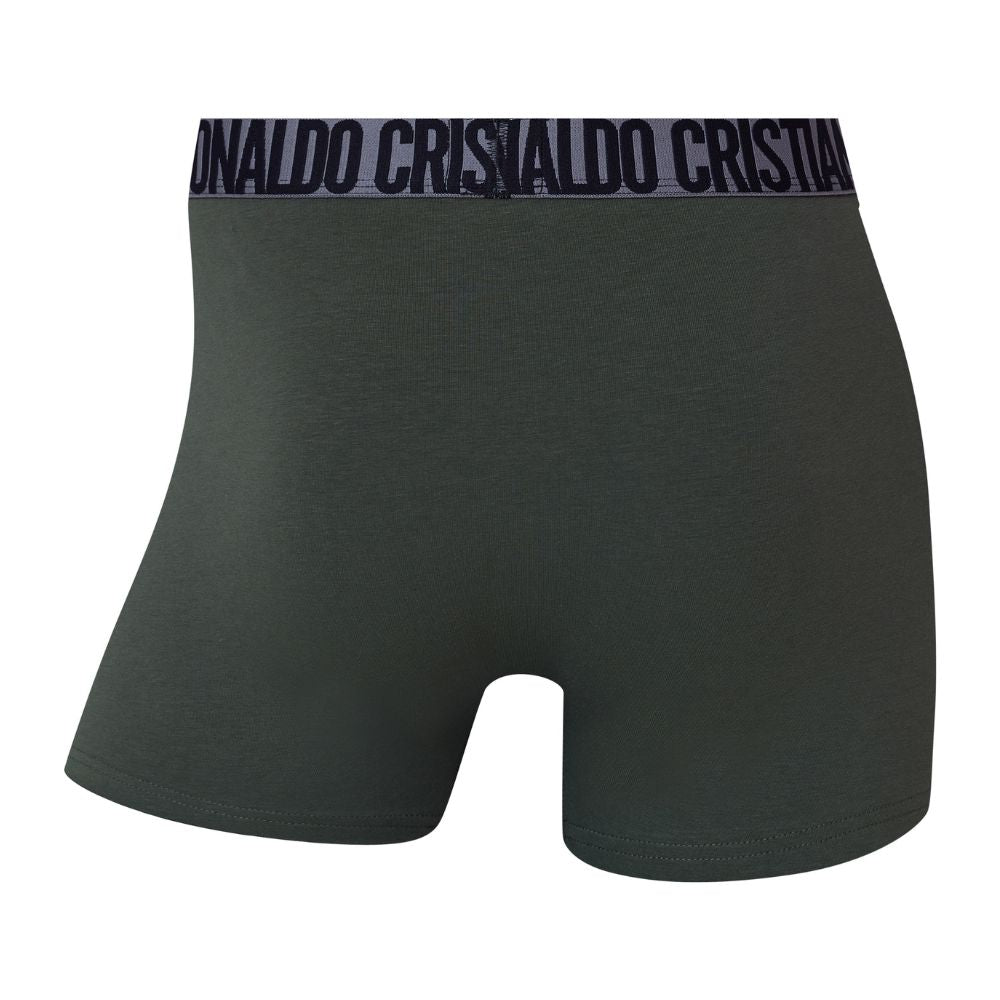 Este pack CR7 inclui 5 boxers em algodão orgânico (2 preto, 1 cinza médio, 1 verde tropa e 1 verde azeitona) e um saco de viagem prático.